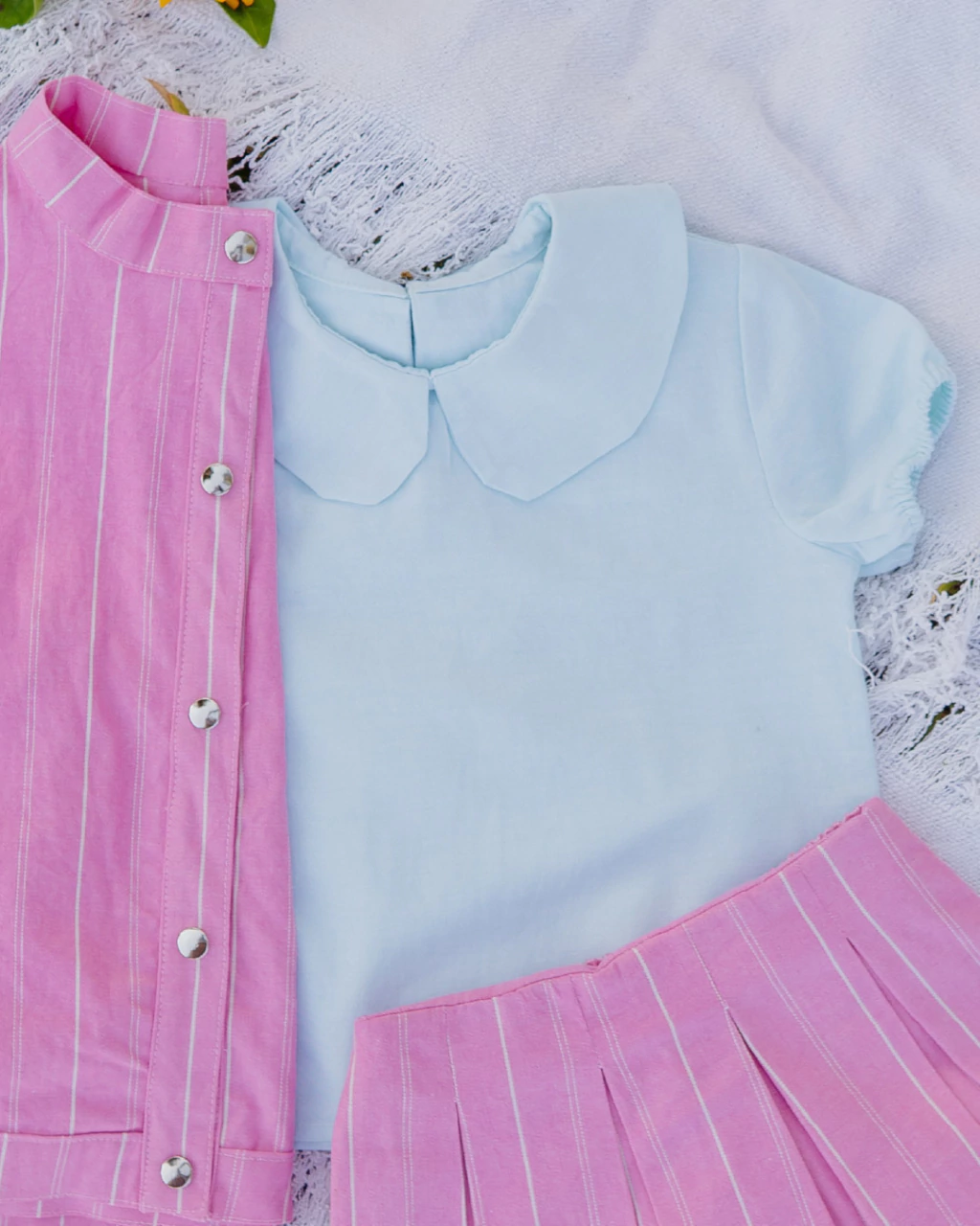O conjunto traz uma short saia plissada que é bem fofa e arrumadinha, com elástico nas costas para garantir conforto e liberdade de movimento — porque criança não para, né? A jaqueta? Ah, essa é um show à parte! Com botões de pressão super práticos e caimento bem retinho, ela esquenta na medida certa quando colocada sobre uma blusa mais quentinha, mas também fica fresquinha com uma peça mais levinha por baixo.